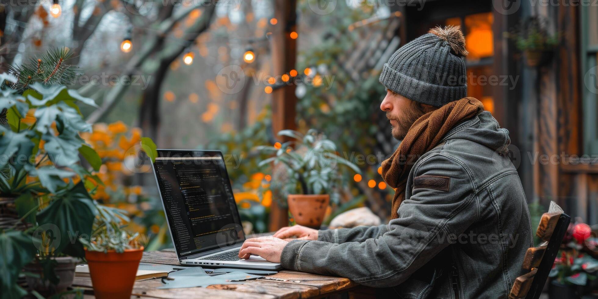 A man is sitting at a table using a laptop computer for work Pro Photo