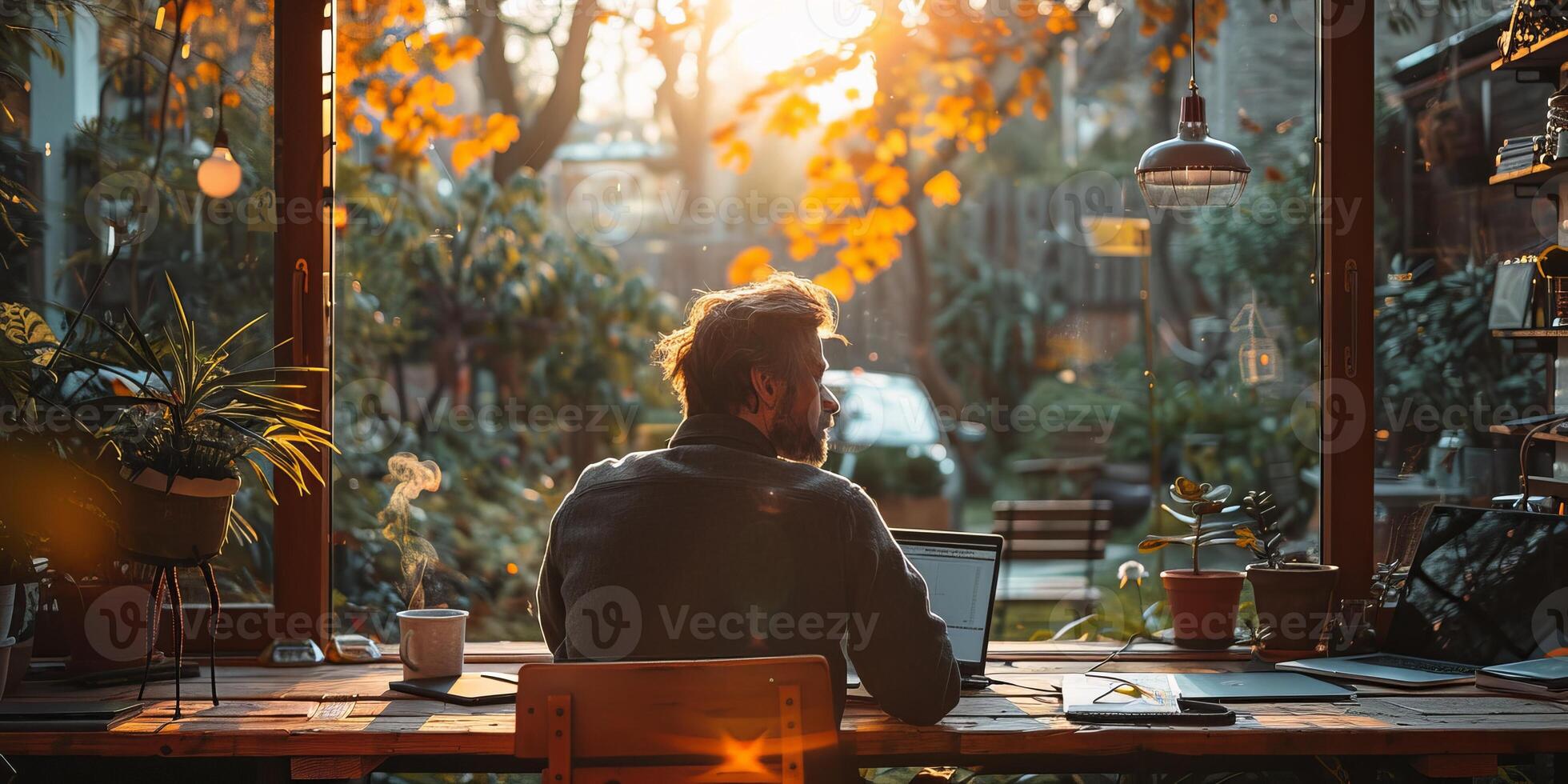 A man is sitting at a table in front of a window, looking out Pro Photo