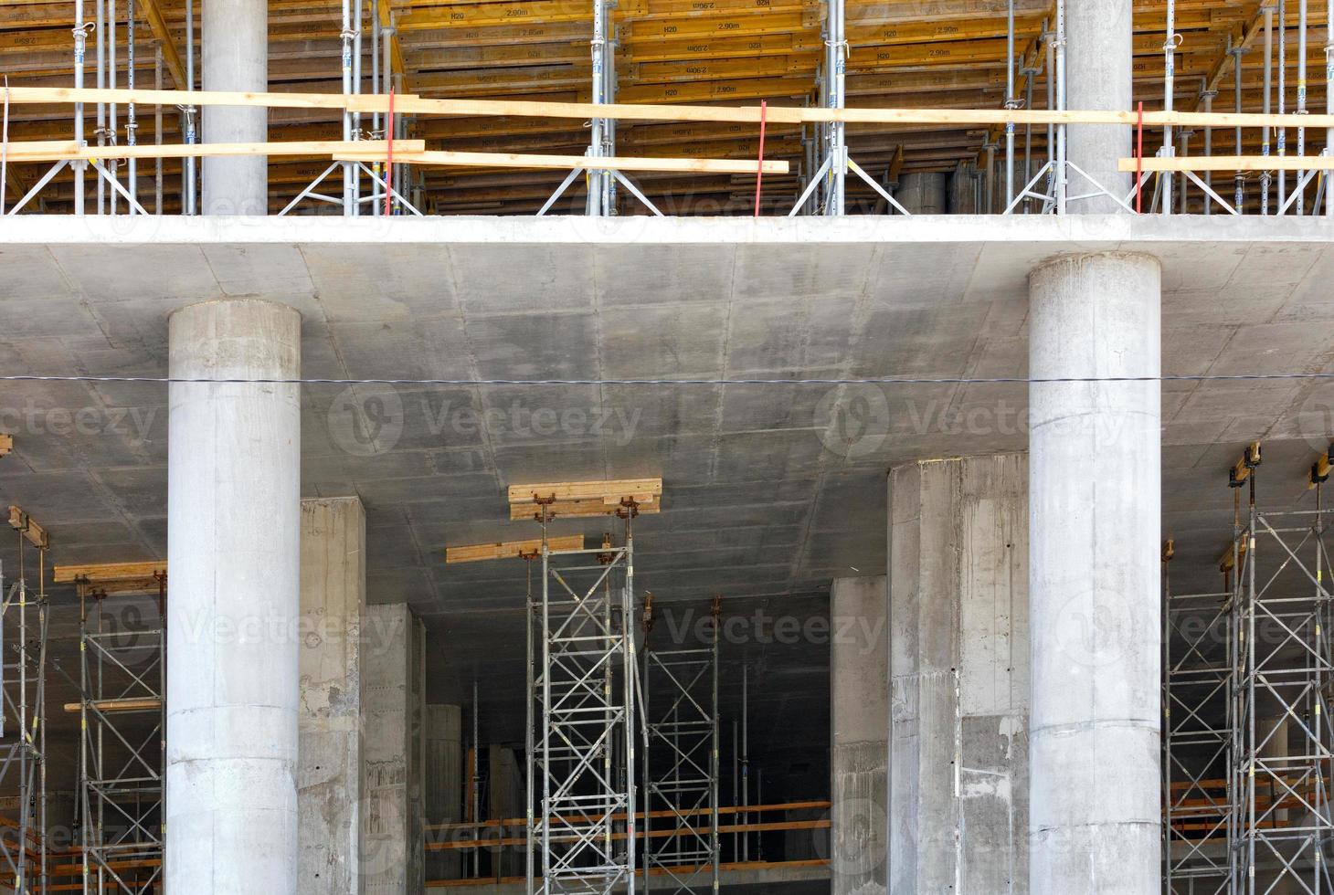 The concept of construction of new buildings using a monolithic-frame method, concrete columns with scaffolding, formwork and metal supports. Pro Photo