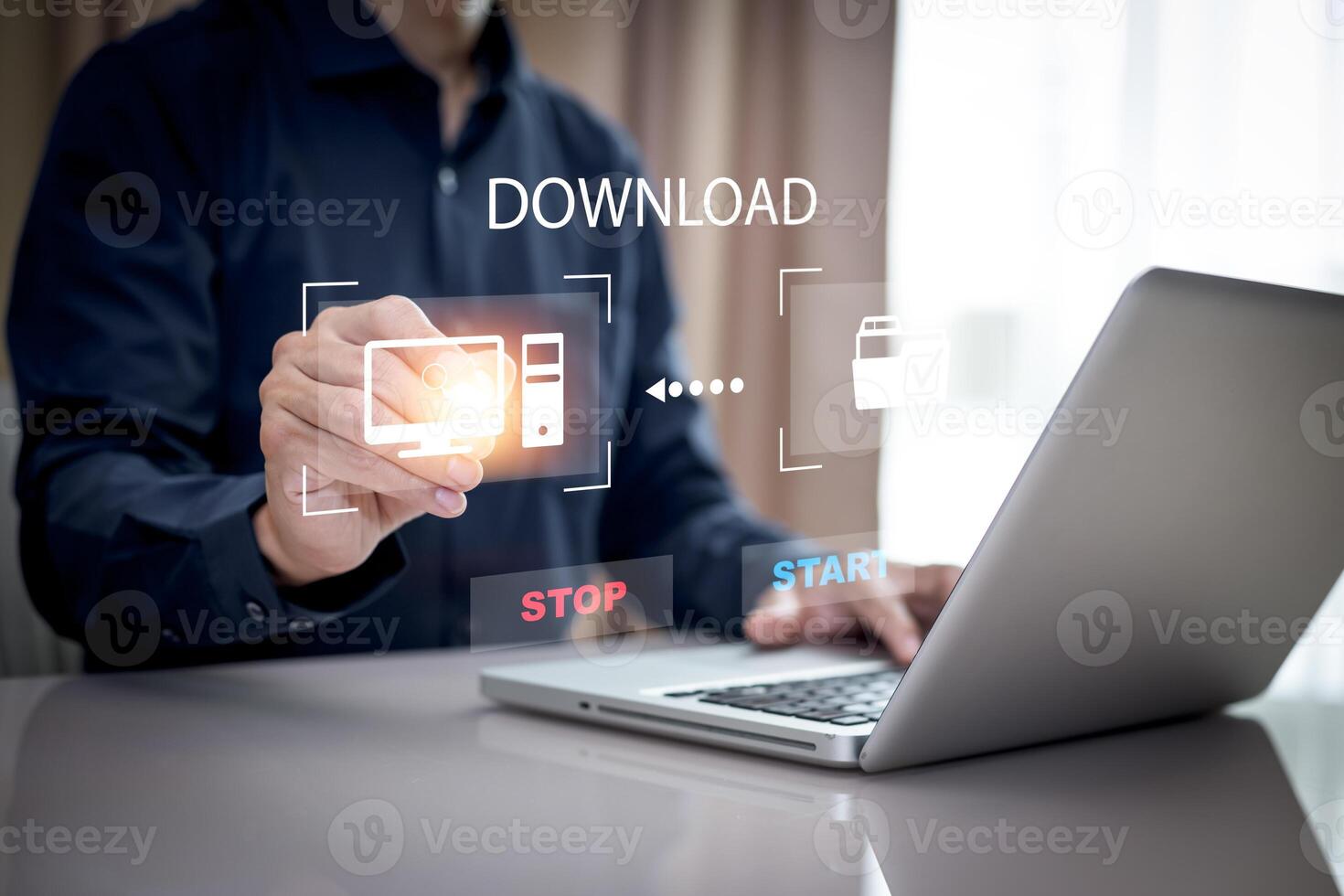 The man is using a computer under the concept of technology, downloading, uploading, and database management.digital communication technology for online ,Cloud Computing Concept Pro Photo