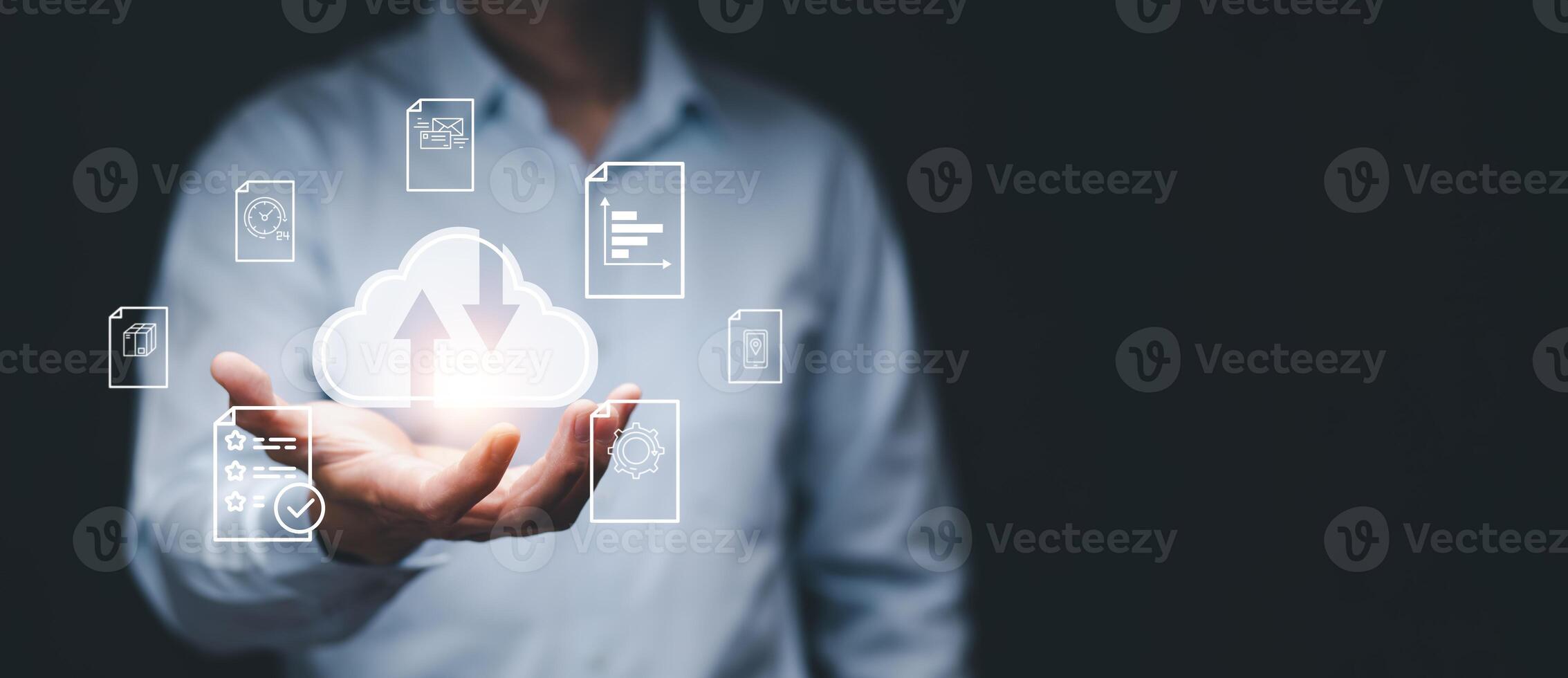 Business people using laptop with cloud computing system , Storage and data transfer Cloud network, Cloud technology. Networking and internet service, sharing download and upload and internet service Pro Photo