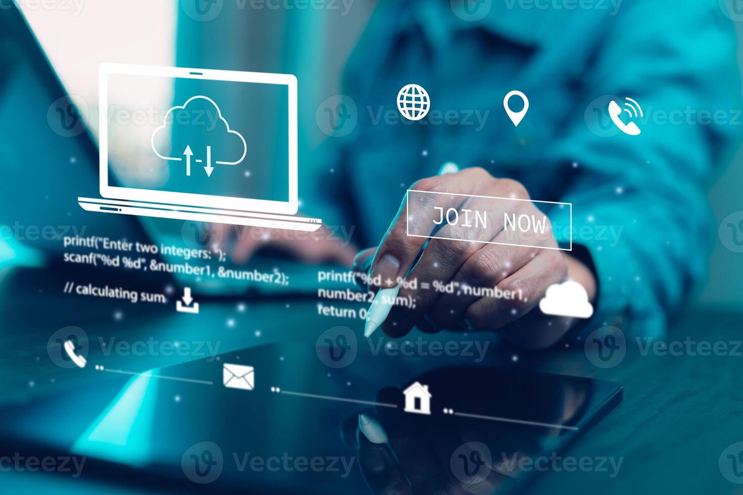 Business people using laptop with cloud computing system , Storage and data transfer Cloud network, Cloud technology. Networking and internet service, sharing download and upload and internet service Pro Photo