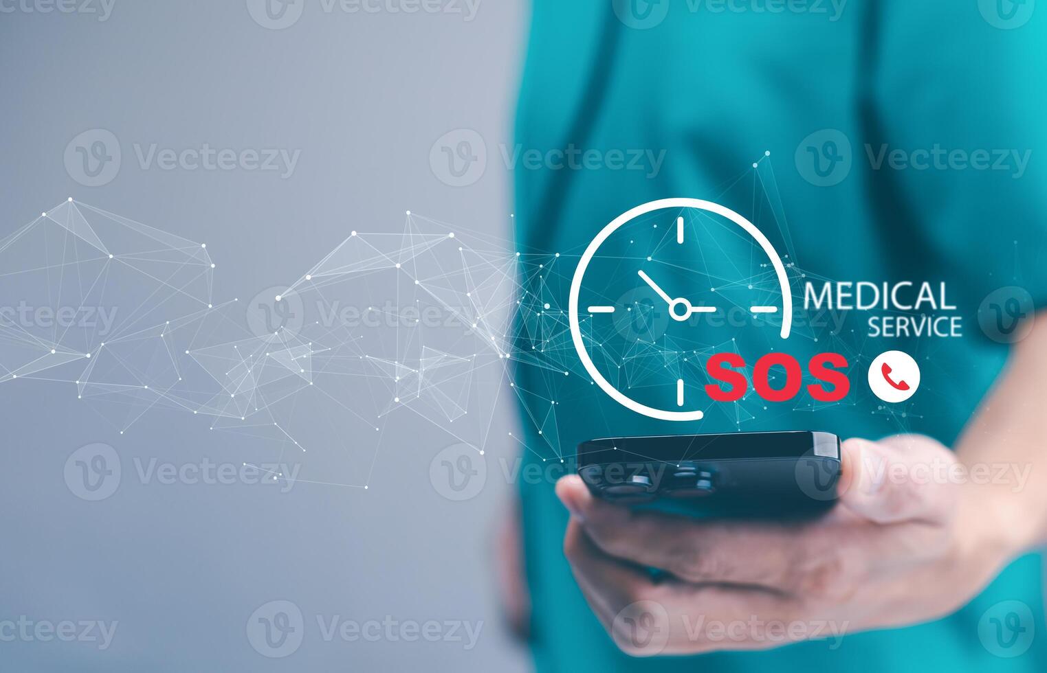 man using Smart Phone with Emergency app in home, call phone, Chat message icon, Emergency application from smartphone for elderly, technology concept.Old hand touch mobile phone and call for help. Pro Photo