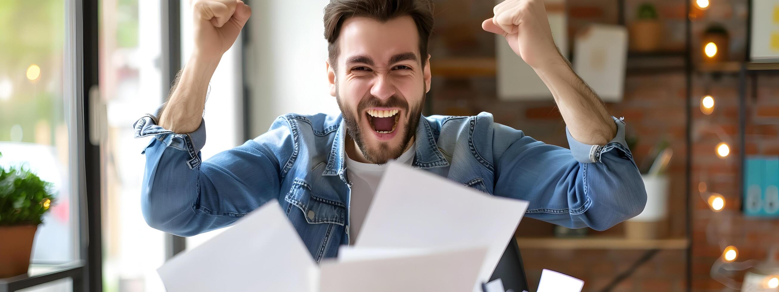 Enthusiastic Young Professional Celebrating Successful Completion of Task on Computer in Office Setting photo