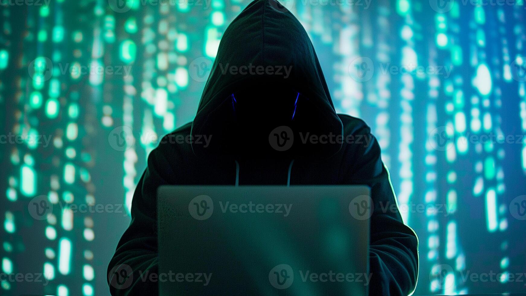 hacker in hoodie with no face using laptop computer on digital background. cyber crime and internet fraud prevention Pro Photo