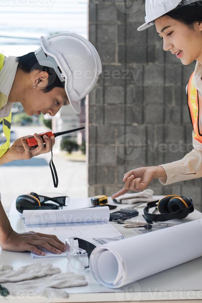 Engineer Teamwork Meeting, Drawing working on blueprint meeting for project working with partner on model building and engineering tools in working site, Construction and structure concept. Pro Photo