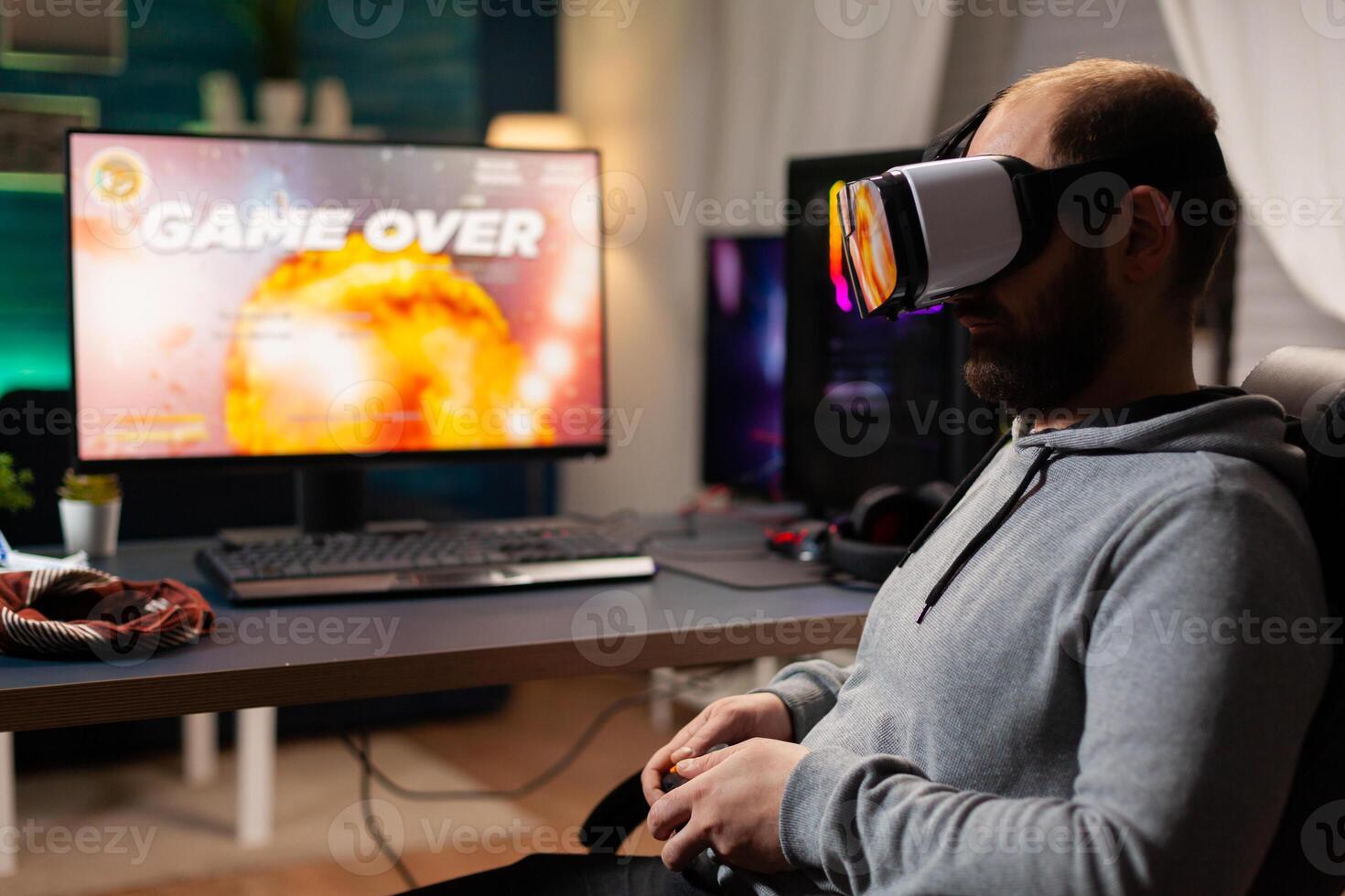 Defeated gamer man losing game tournament playing with virtual reality headset. Competitive player using joystick for online competition late at night in gaming room Pro Photo