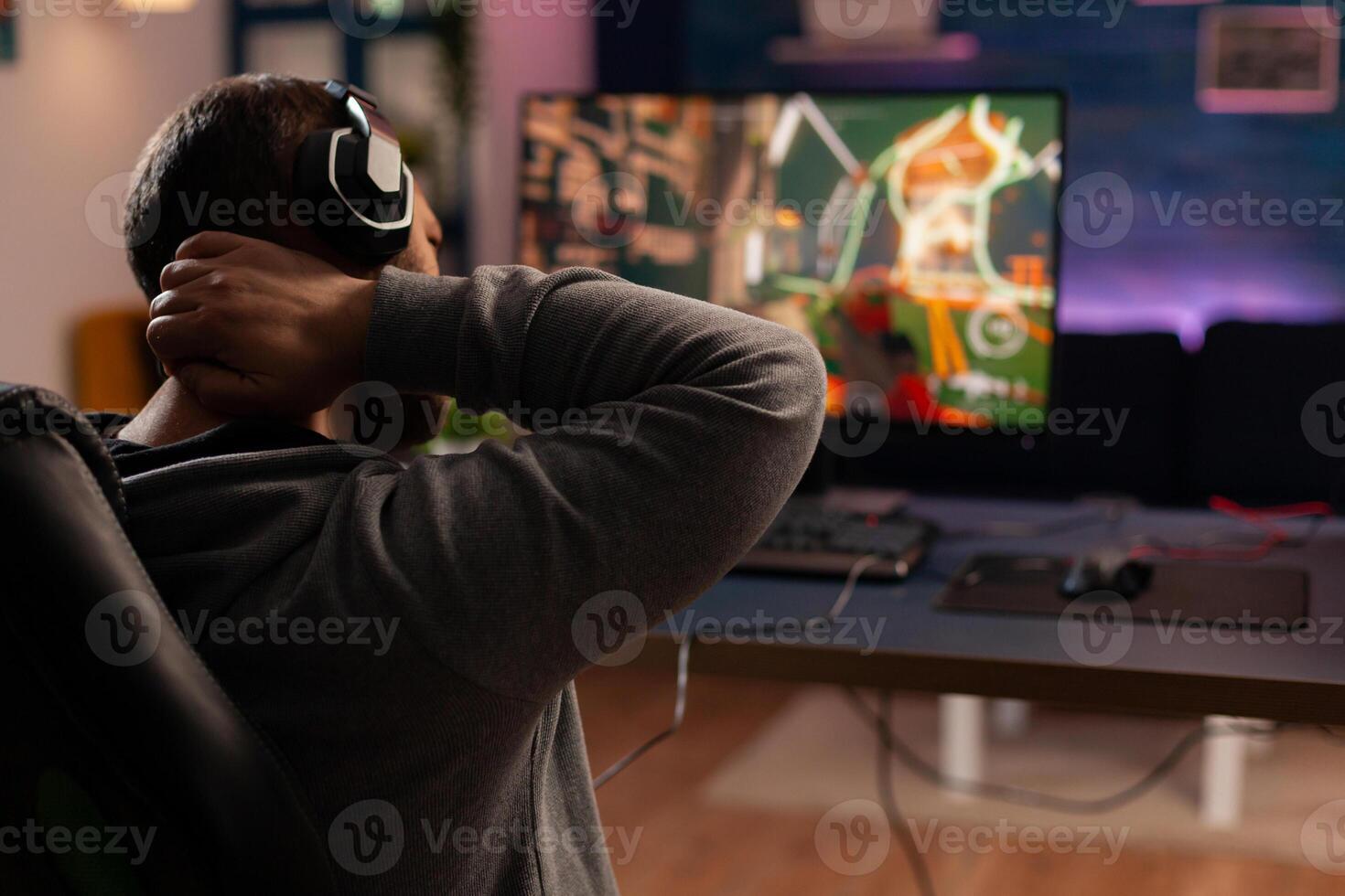 Professional player playing shooter videogame new graphics on powerful computer from home. Virtual online streaming cyber performing during game tournament using technology network wireless Pro Photo