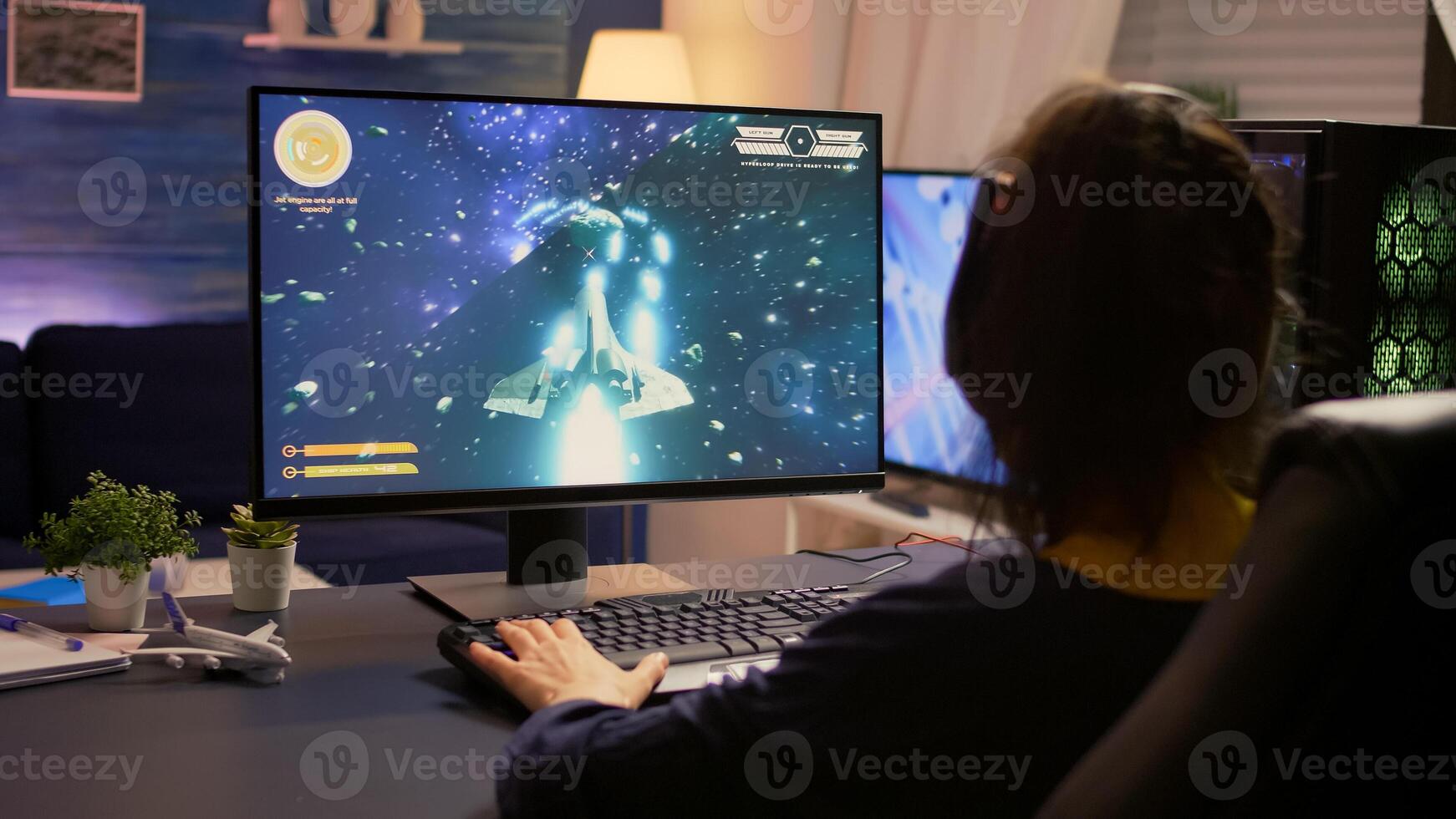 Player sitting on gaming chair and start playing space shooter game wearing professional headset. Modern studio equipped with RGB system desktop, keyboard, mouse, using technology network wireless Pro Photo