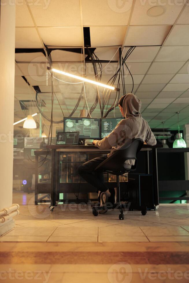 Asian IT specialist planting anonymous attack on government network, creating malware to access sensitive information on database. Young man using muliple monitors at night time. Pro Photo