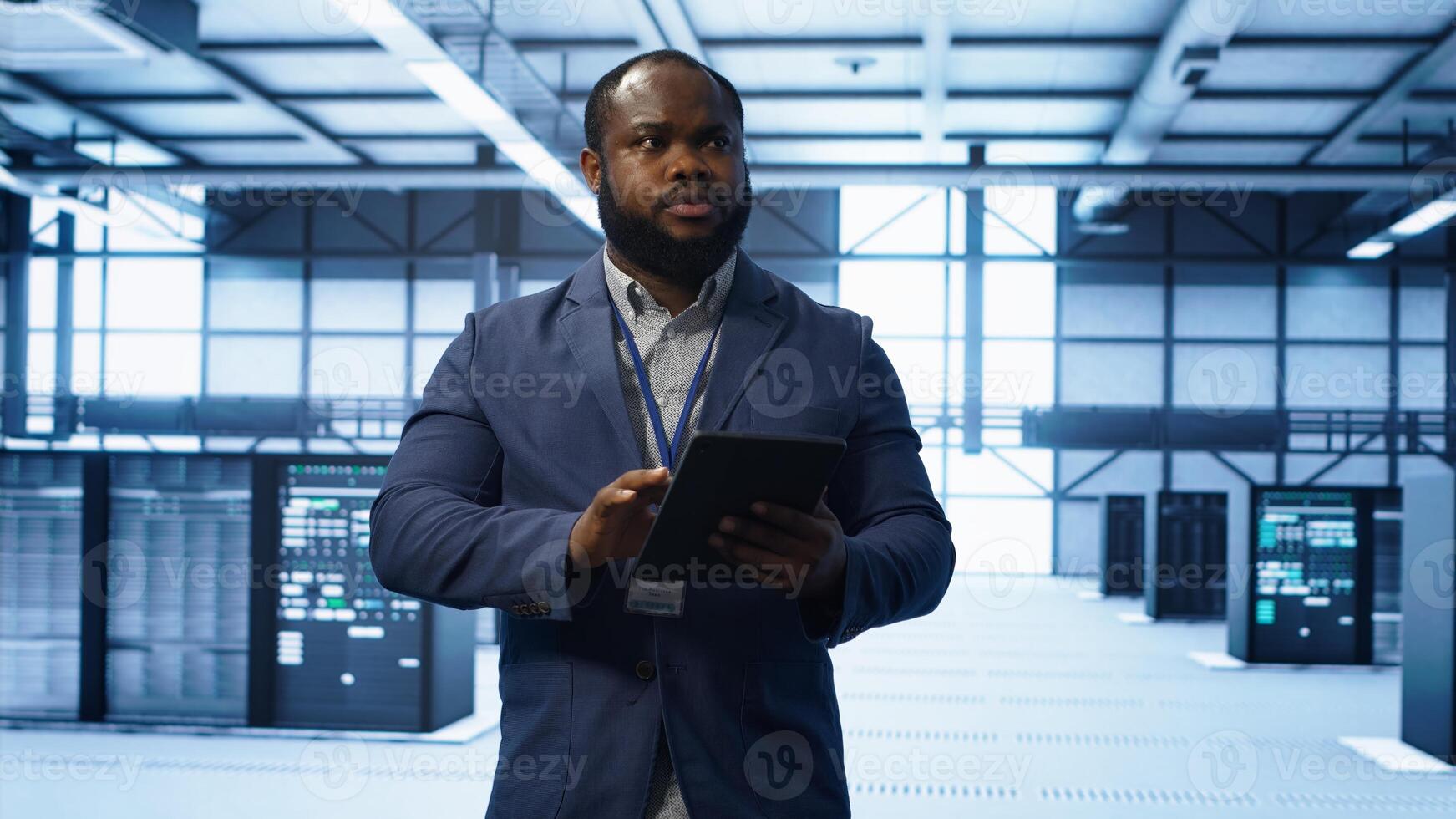 Software developer managing data center with advanced technology, ensuring efficient network management. Admin walking in server room, optimizing data center infrastructure with tablet, camera A Pro Photo