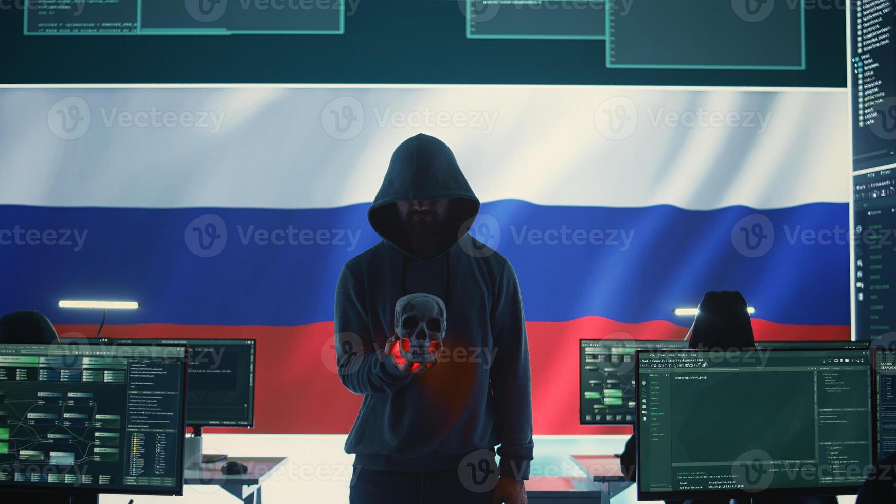 Conceptual image of a hooded russian hacker creating hazardous alerts, holds a skull and warning of death threats. Russian federation works on cybercrime and violence, panic and torment. Camera B. Pro Photo