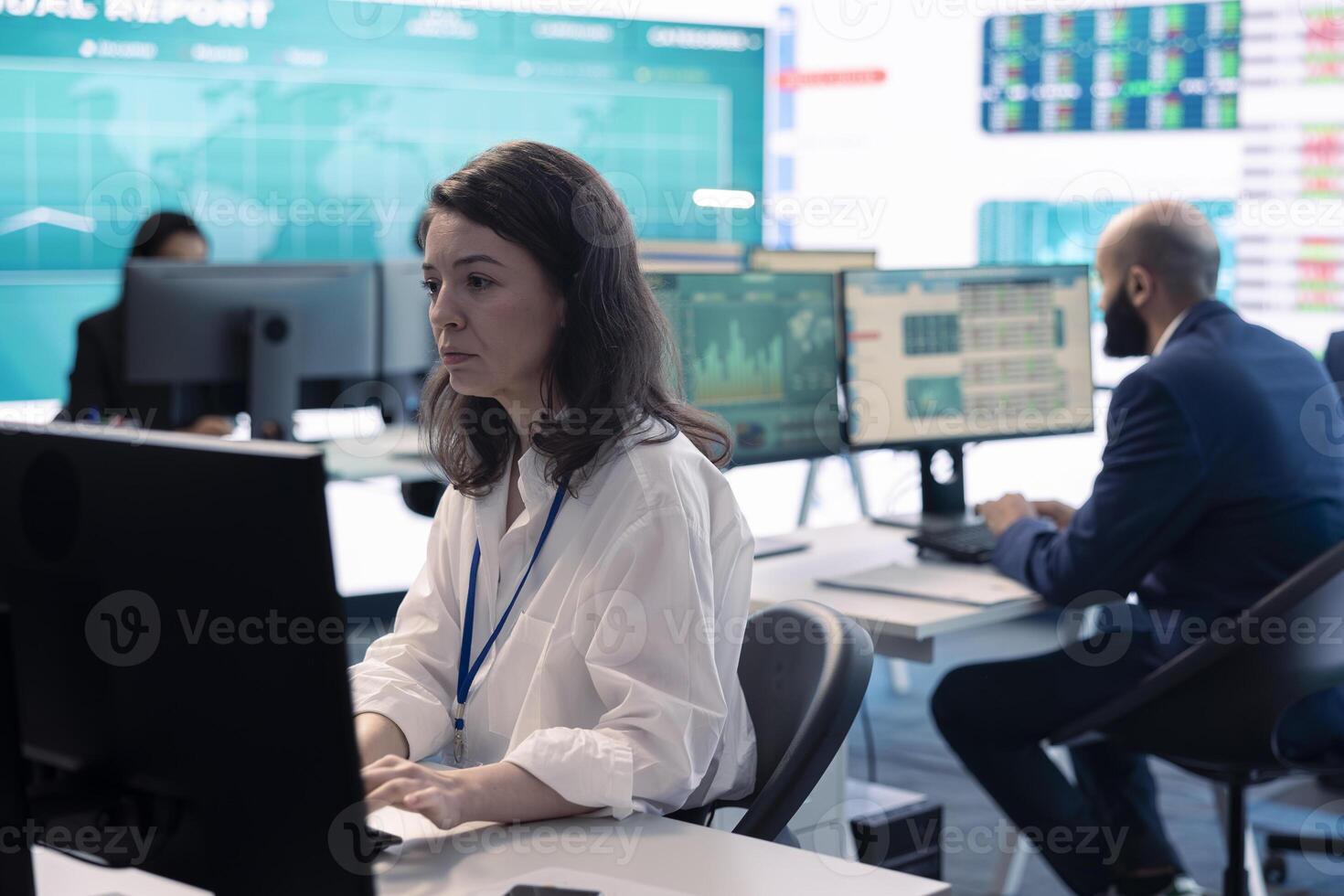 Project manager examining key performance metrics to ensure global business success, working with annual infographics to understand what needs improving. Multinational company activities. Pro Photo