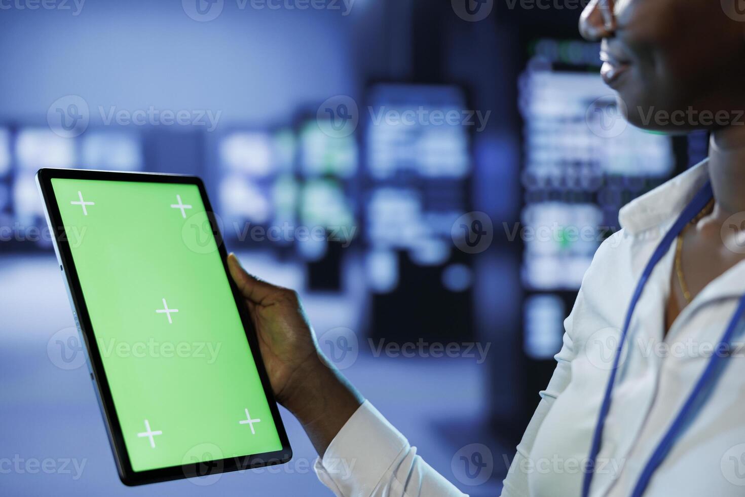 Trained technician in server room using mockup tablet to future proof network from downtimes and unexpected system failures. Expert with isolated screen device ensuring increased data security Pro Photo