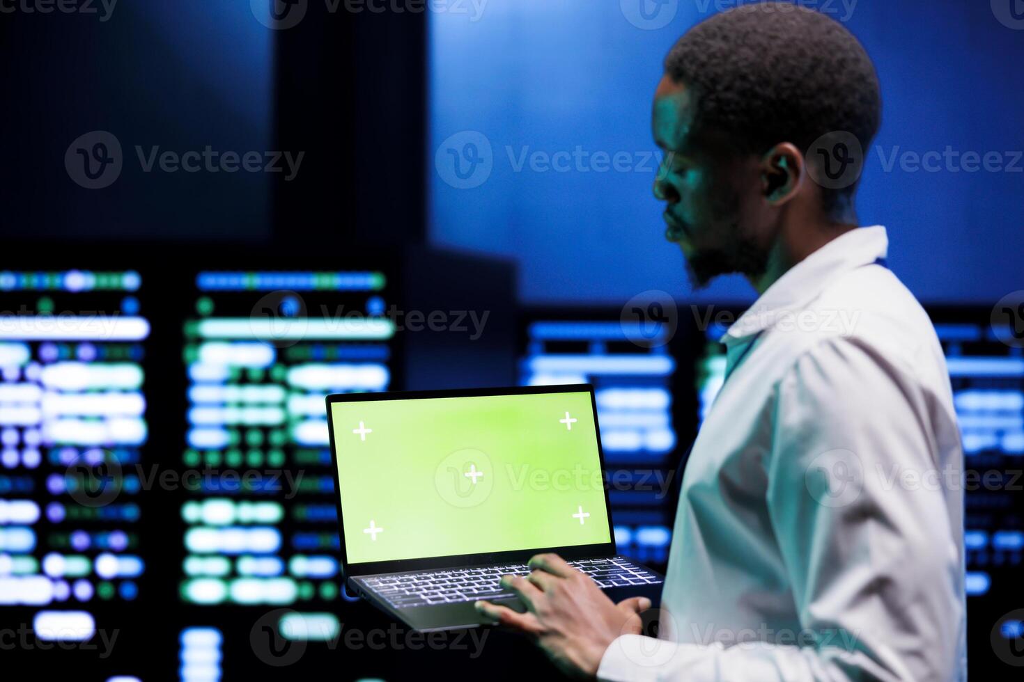 Engineer using green screen laptop to do hardware maintenance in professional data center. Expert optimizing server room equipment, ensuring seamless data operations and system stability Pro Photo