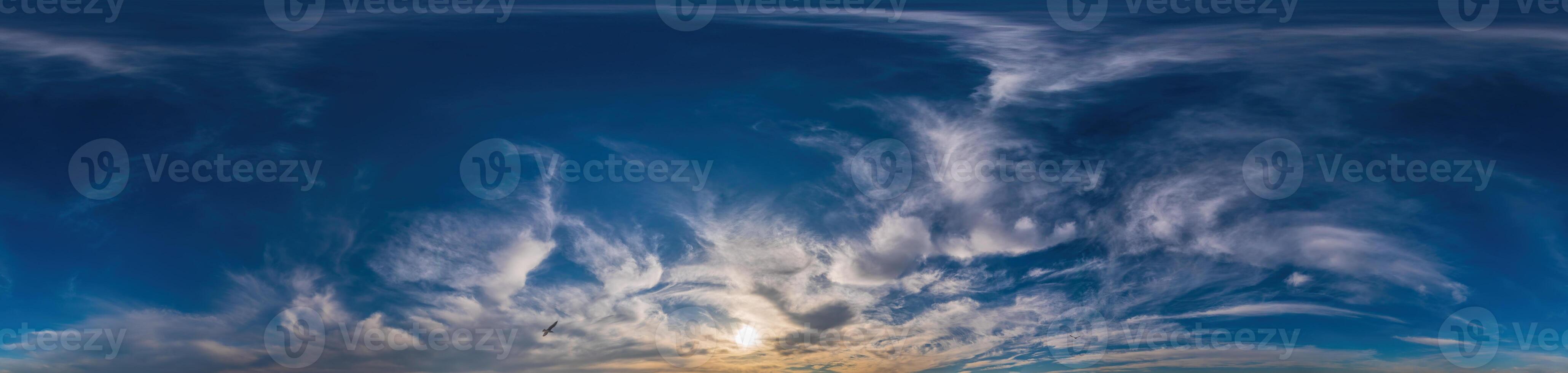 Sunset sky panorama with Cirrus clouds in Seamless spherical equirectangular format. Complete zenith for use in 3D graphics, game and for composites in aerial drone 360 degree panoramas as a sky dome Pro Photo