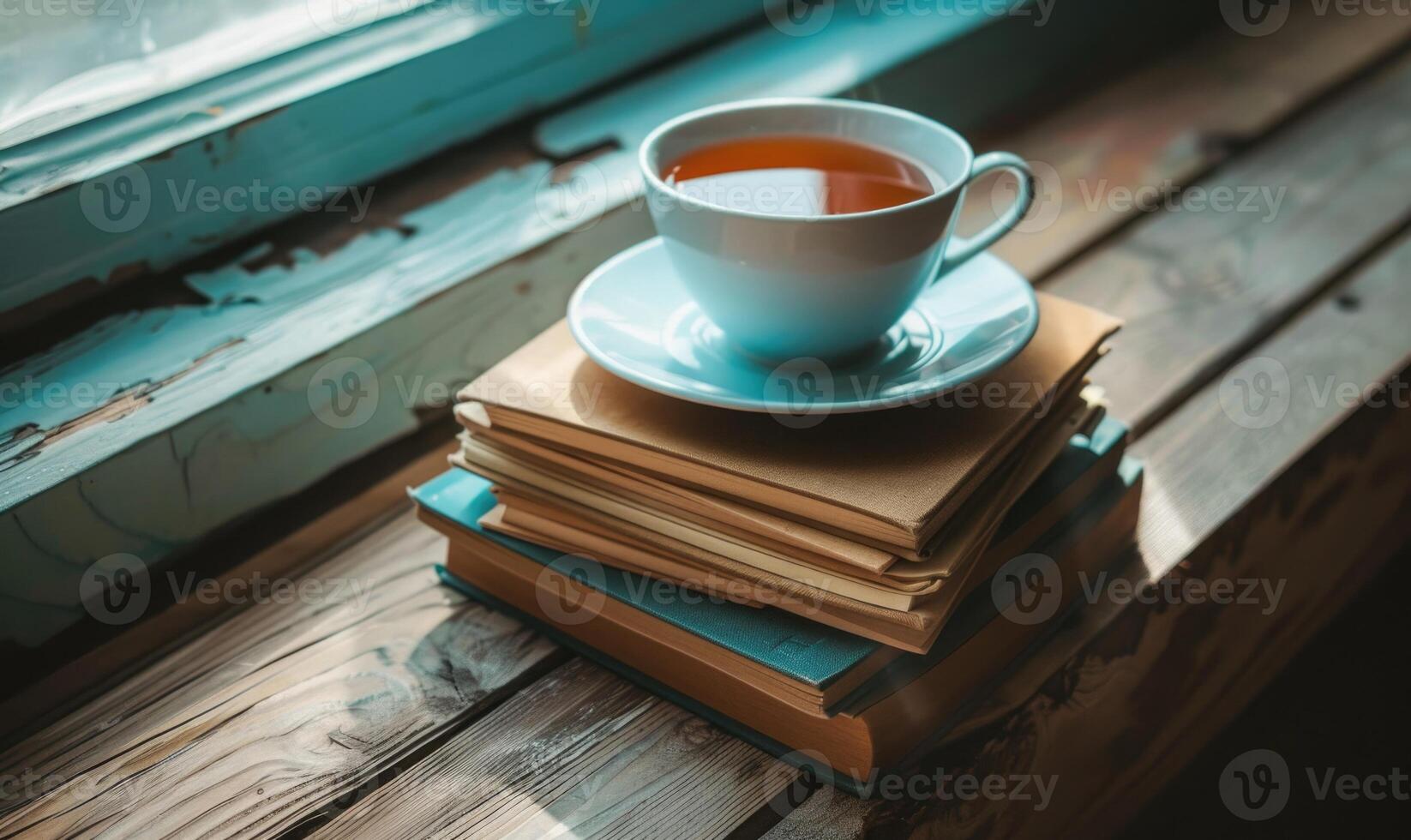 Stack of books on a wooden table with a cup of tea next to it, shadow from window, top view Pro Photo