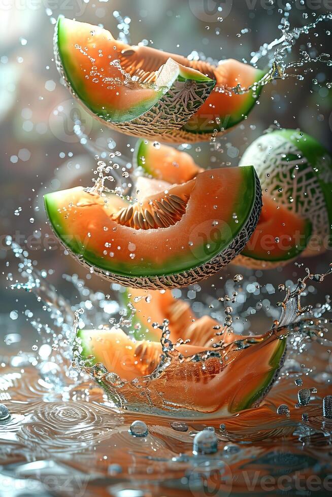 Fresh cantaloupe slices splashing into water, capturing the vibrant and refreshing essence of summer fruits in a dynamic composition. Pro Photo