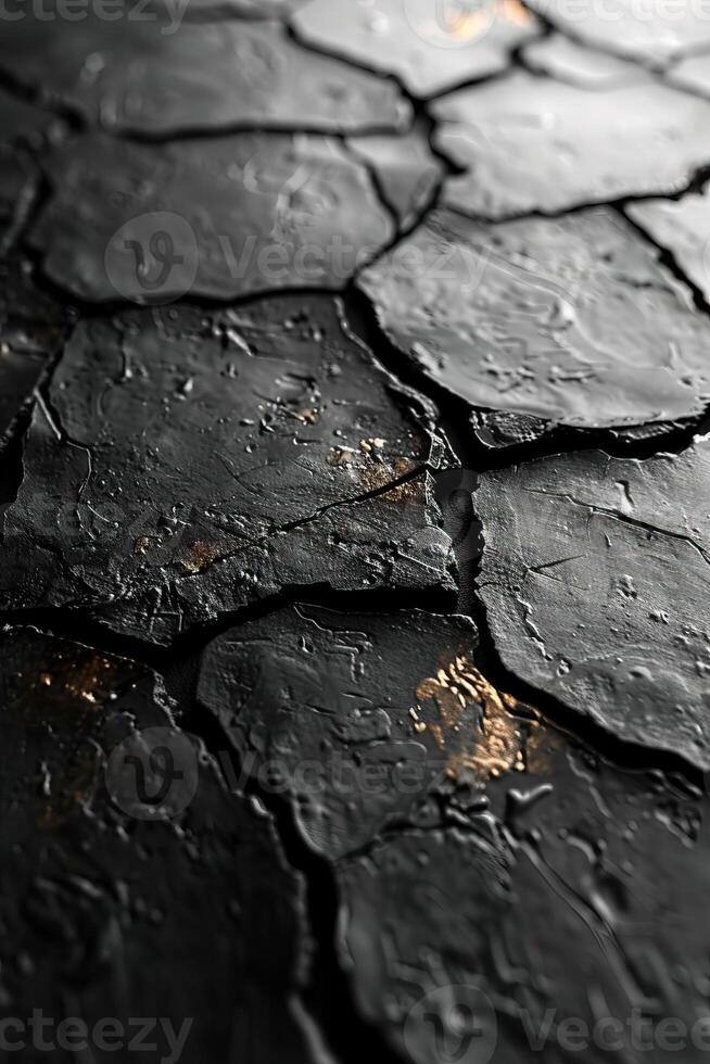 Close-up of a textured black surface with irregular shapes and a glossy finish, exhibiting detailed patterns and intricate design elements. Pro Photo