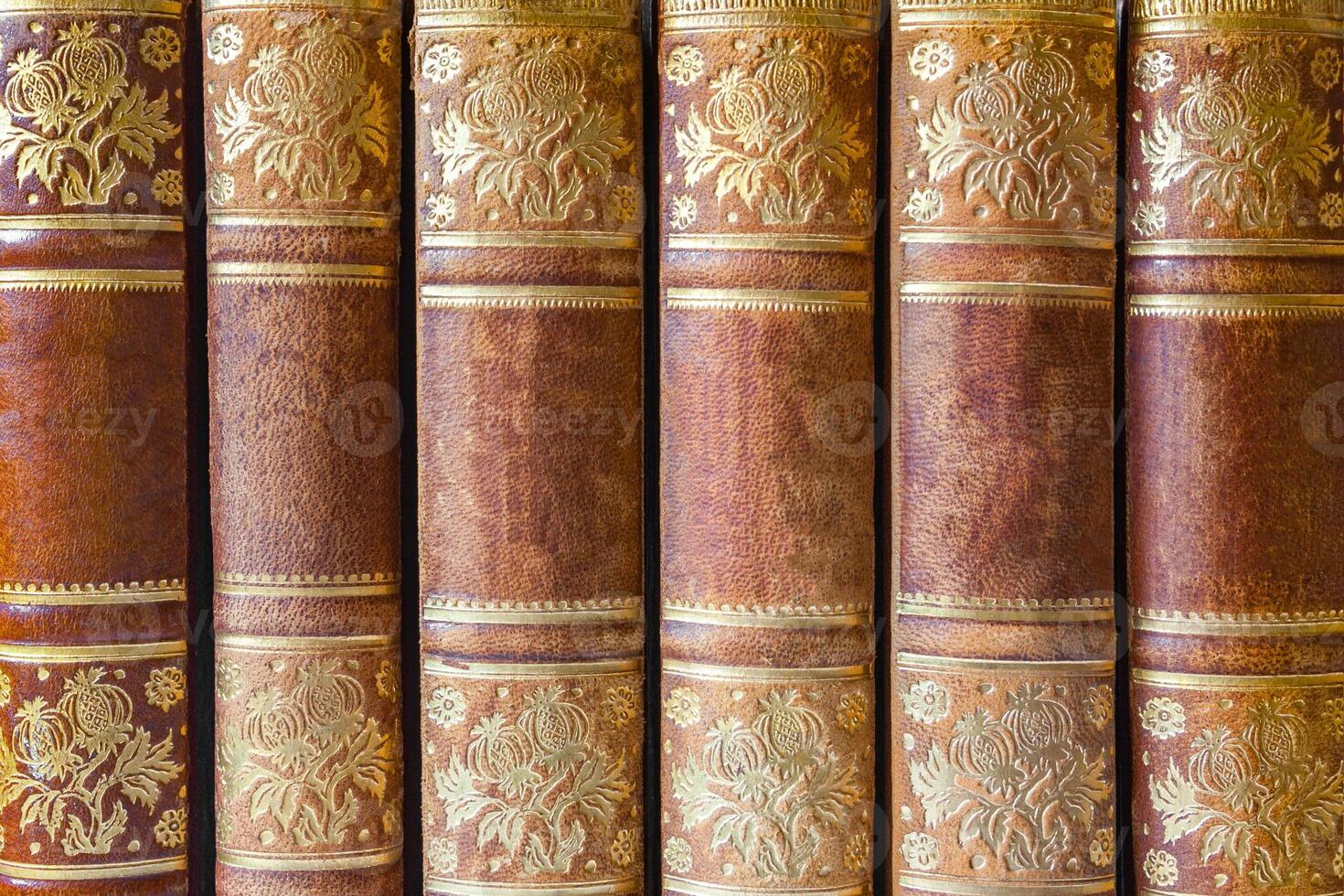 Old closed brown books with gilded patterns in a row as background, texture Pro Photo