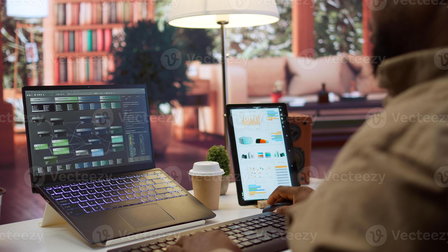 Professional software developer at desk working on AI coding and machine learning projects, showcasing innovation in software development and digital business. Internet of things. Camera B. Pro Photo