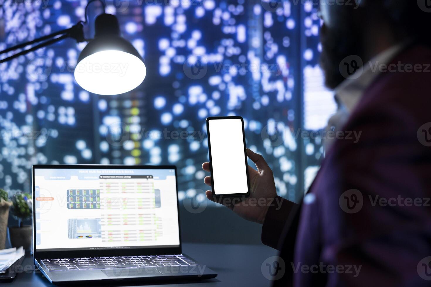 Board member checks white screen on mobile phone layout, analyzing transactions and revenue to expand company activity. CFO working with blank copyspace template and global data at night. Pro Photo