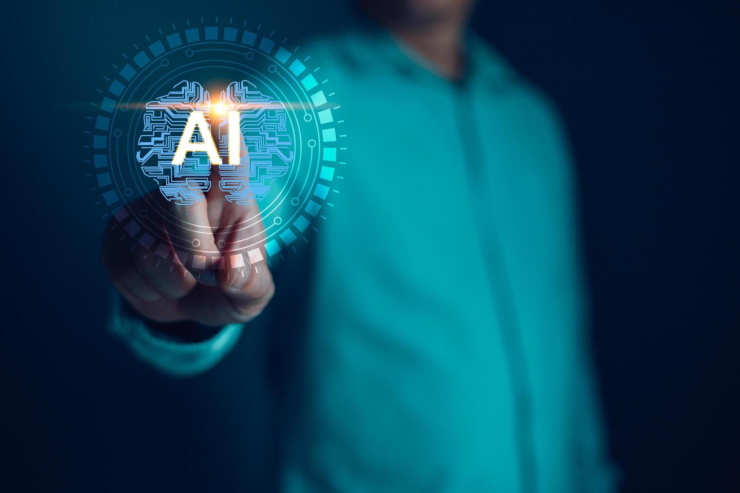 man touch brainstorm circuit tech. Digital Artificial Intelligence AI technology disruption concept. Big data storage.Innovative technology Machine learning support in the business. photo