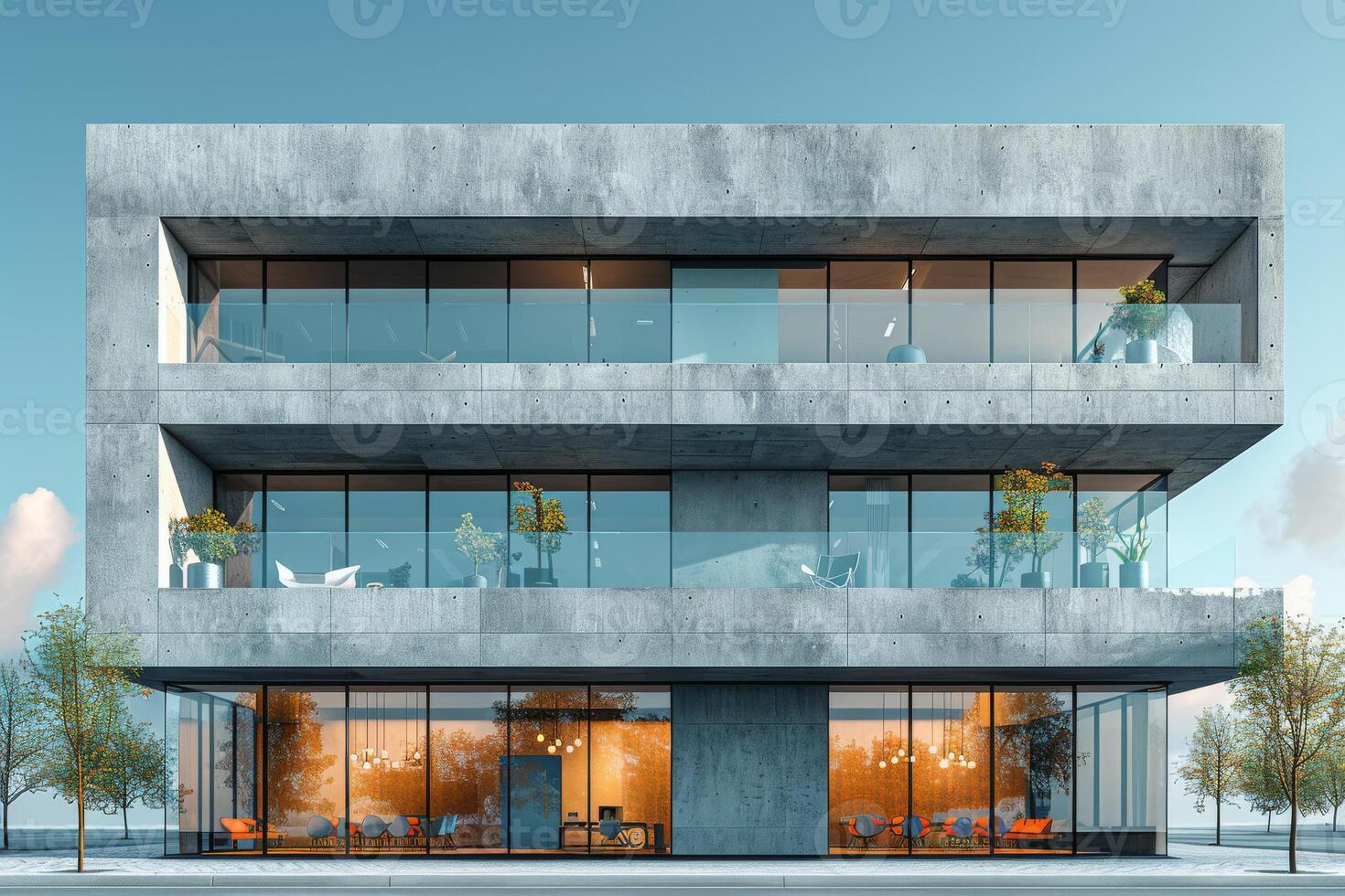 The modern threelevel concrete structure includes large glass windows and roomy balconies, all in a simple outdoor setting, ideal for cityscape views and ample daylight in a workplace setting Pro Photo