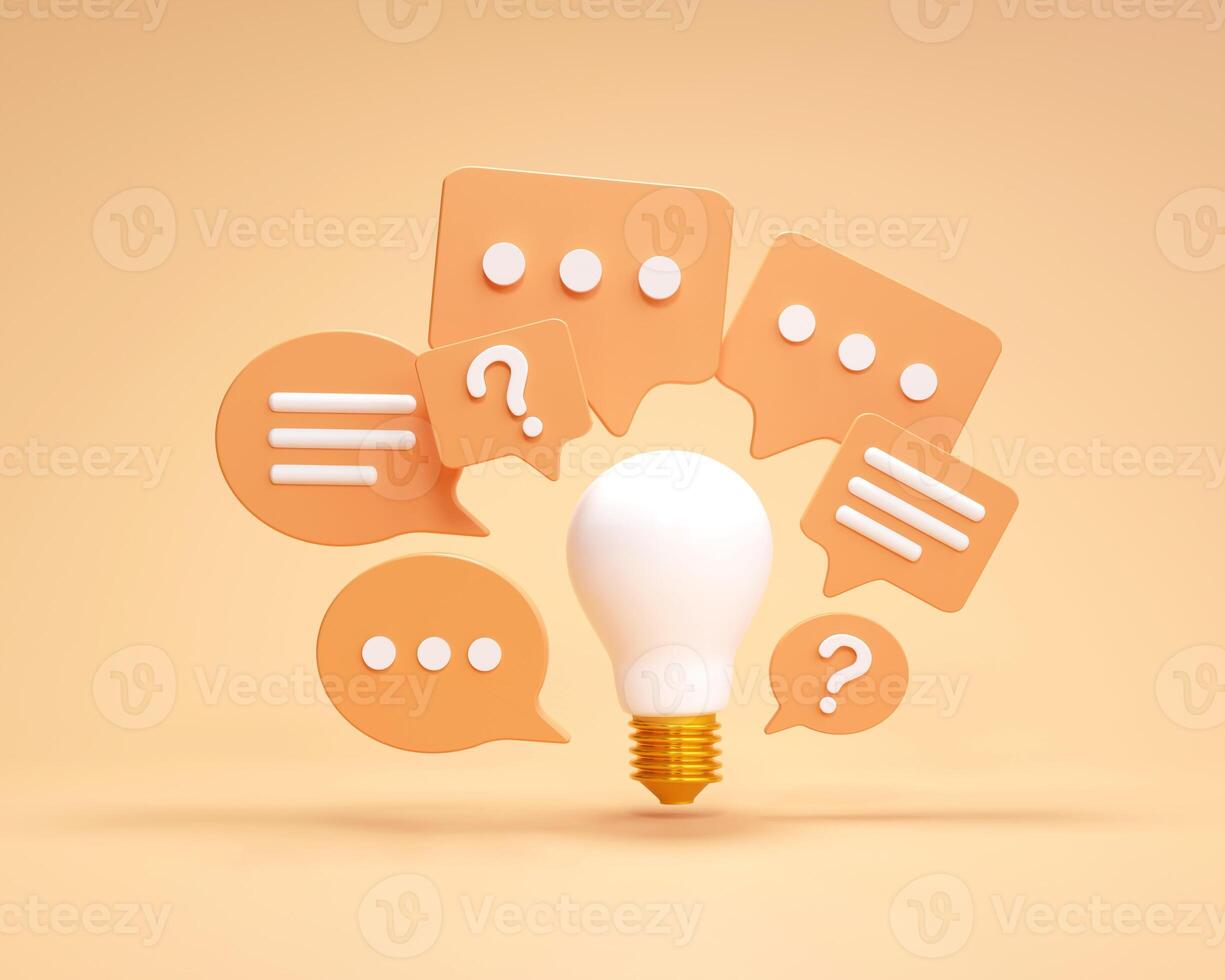 Minimalist speech bubbles talk icons floating over light bulb on yellow background. Concepts of communication, new ideas, brainstorming, and modern problem solving. Pro Photo