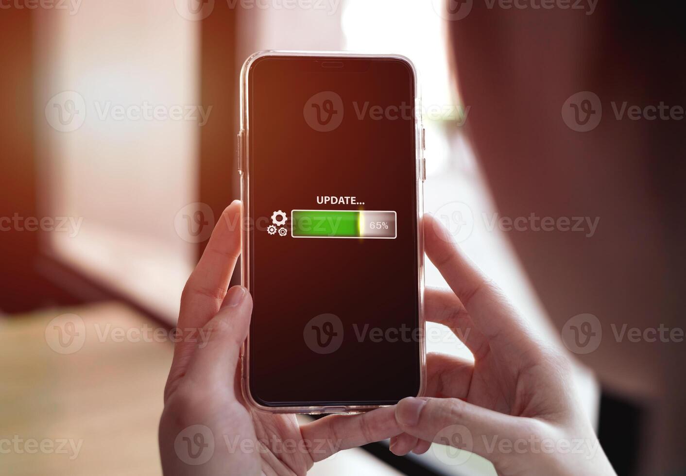 Improving modern technology, updating smartphone software with online networks. Showing screen on a smartphone with loading bar installing updates to improve system security. Pro Photo