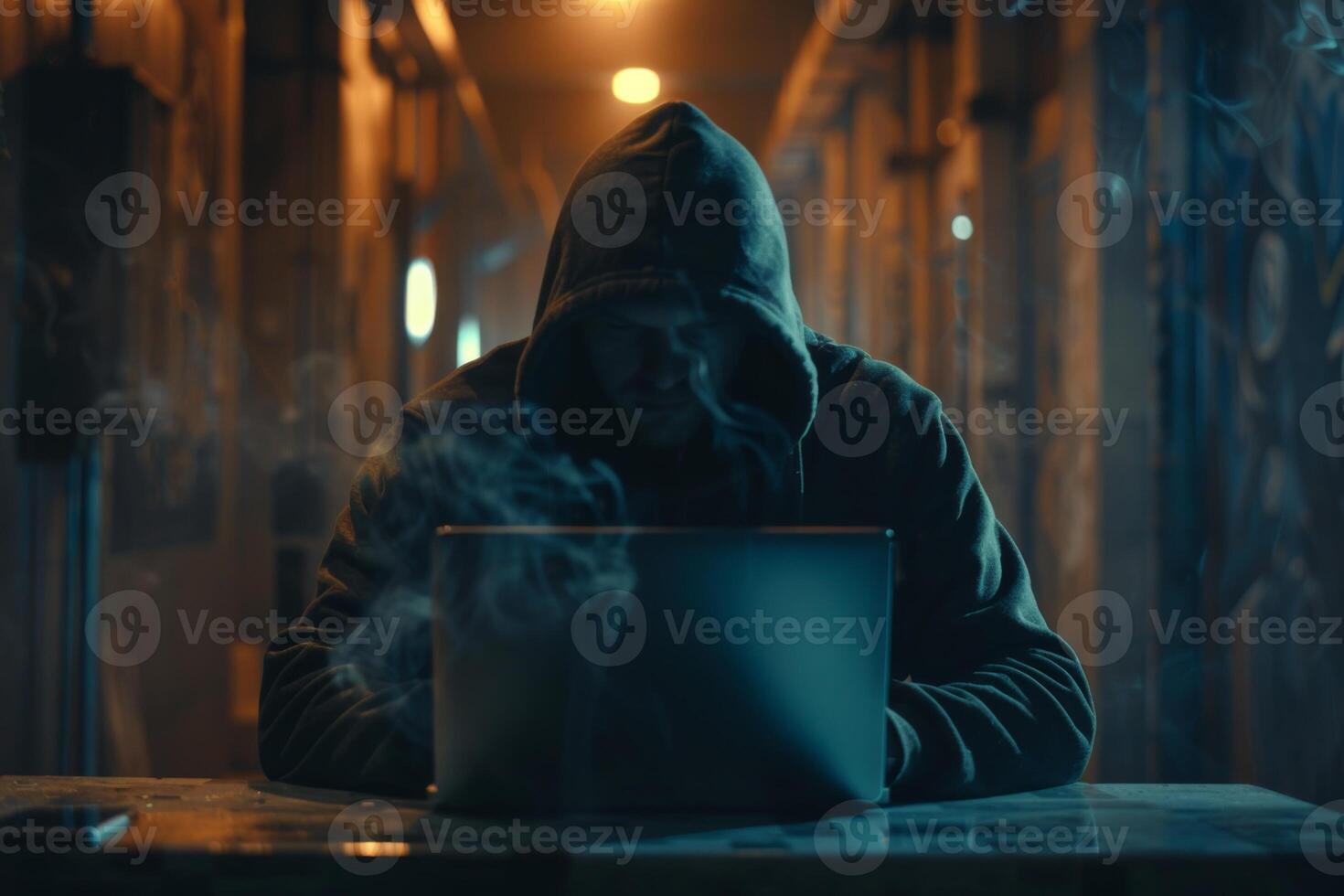Hacker in hood hacking at computer in dark room. Computer criminal uses malware to hack devices Pro Photo