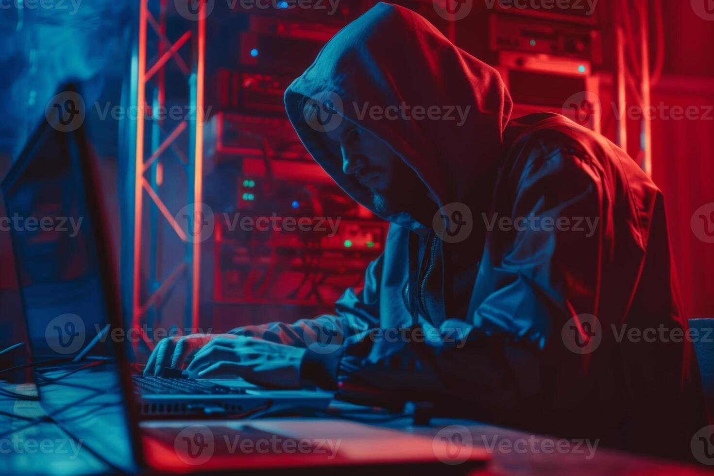 Hacker in hood hacking at computer in dark room. Computer criminal uses malware to hack devices Pro Photo