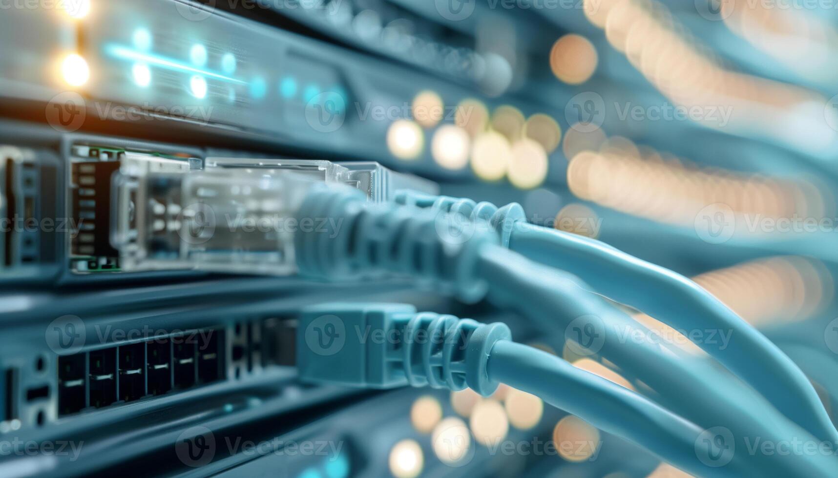 Close-up of network cables connected to servers in a data center. Technology infrastructure, cloud computing, and internet communication concept. Pro Photo