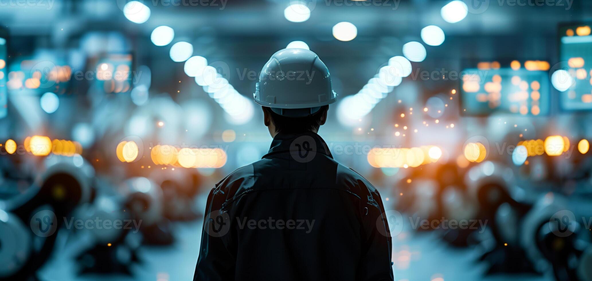 Rear view of an engineer wearing a helmet and working in a high-tech, modern factory with advanced machinery and equipment. Pro Photo