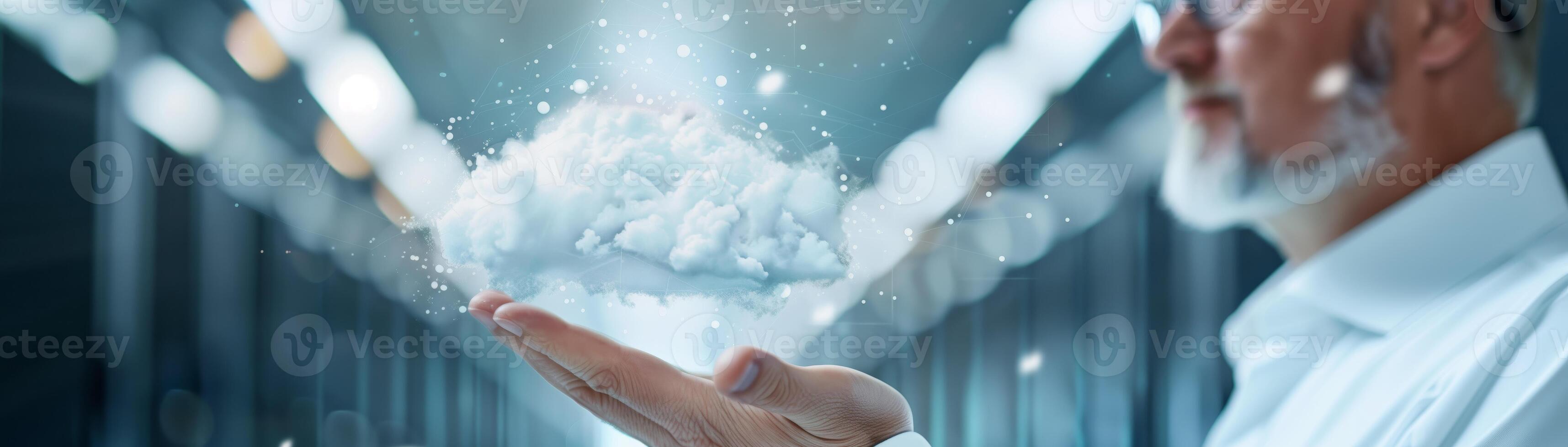 Man holding holographic cloud in data center, representing cloud computing, digital storage, and technology services in futuristic environment. Pro Photo