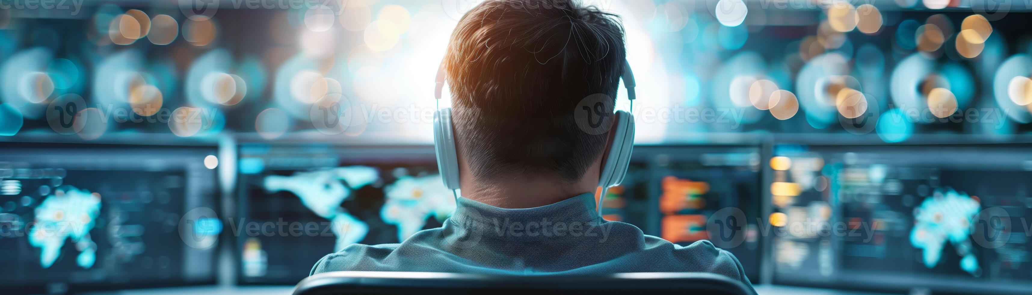 Man in front of multiple screens monitoring data, symbolizing cybersecurity and tech surveillance in a high-tech control room. Pro Photo