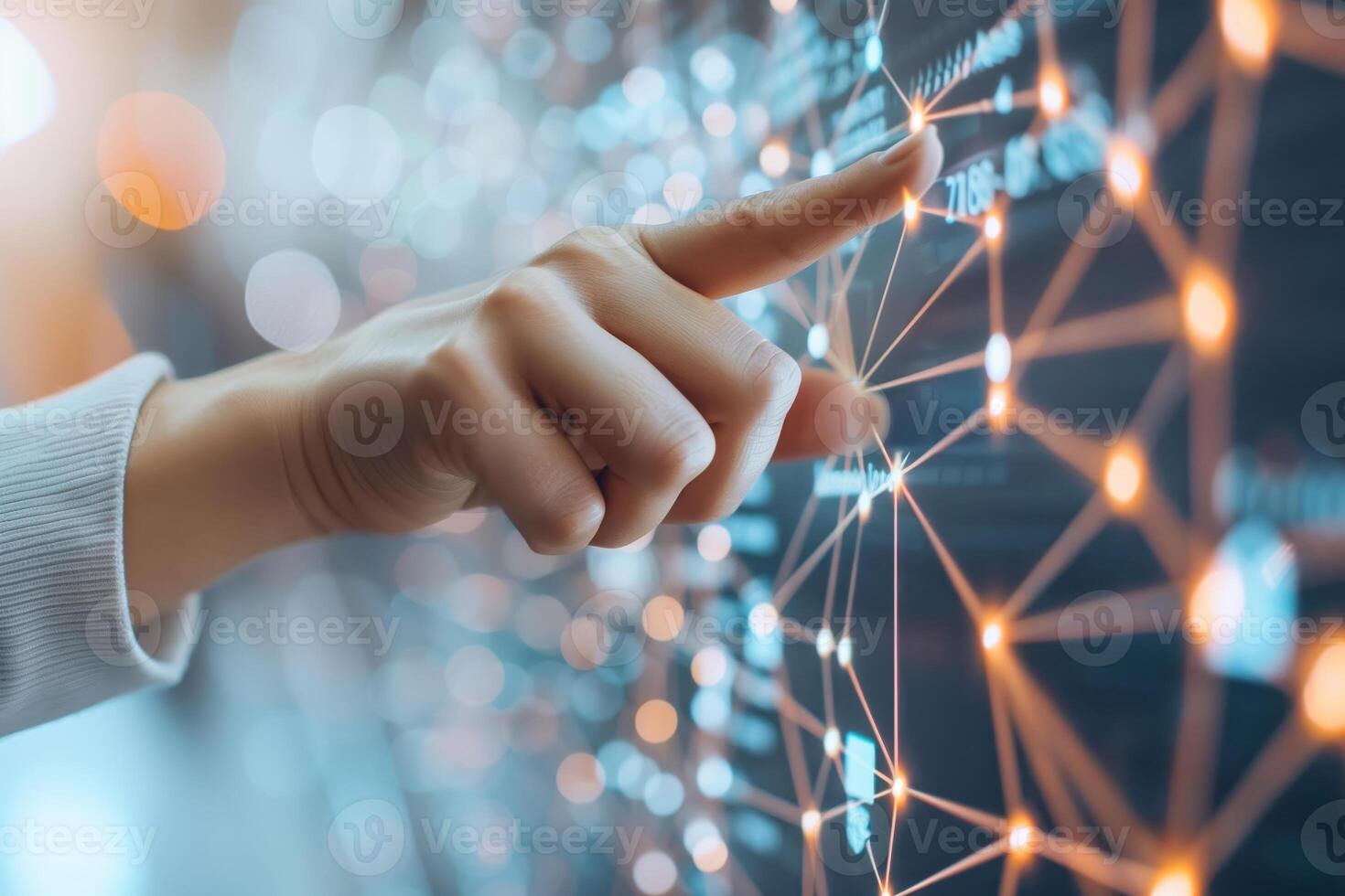 Hand interacting with digital interface, touching network connections with glowing nodes. Concept of technology, data analysis, and innovation. Pro Photo