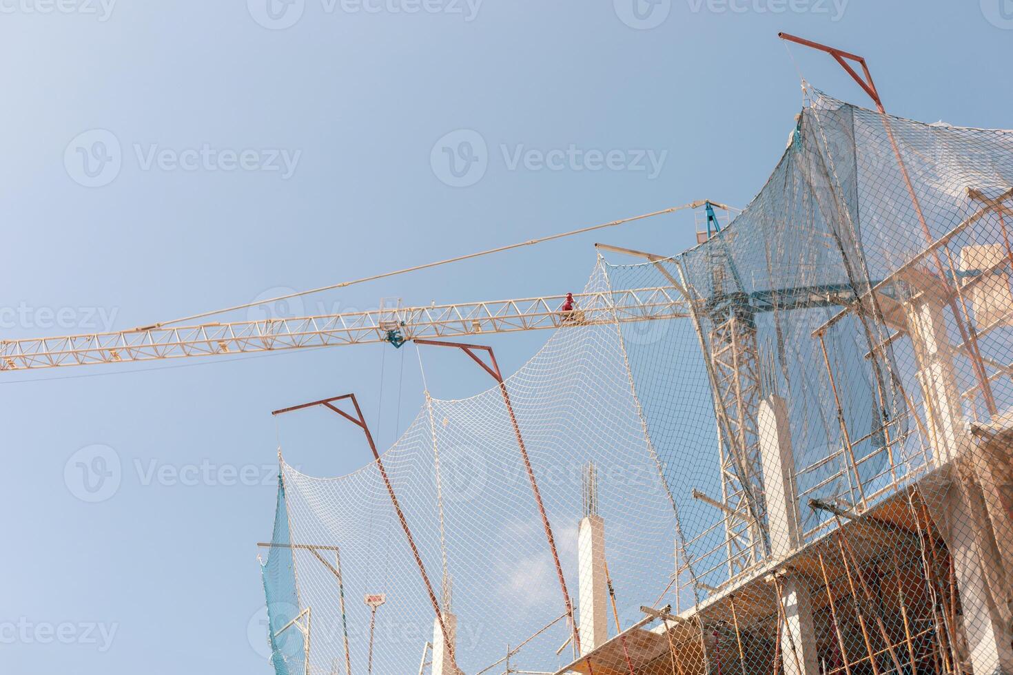New building construction process. Safety nets, structural beams highlight ongoing work. Multi-level architecture. Ideal for articles on urban development, real estate investment. Copy space for text. Pro Photo