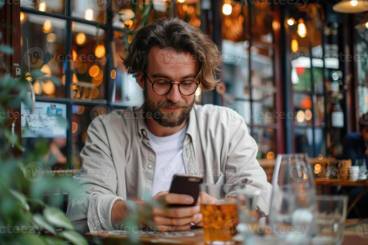 young man sitting in coffee shop using smartphone, summer. Pro Photo