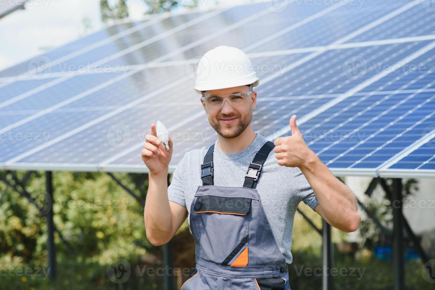 Technical expert in solar photovoltaic panels, remote control performs routine actions to monitor the system using clean renewable energy in the hand a light bulb. Pro Photo