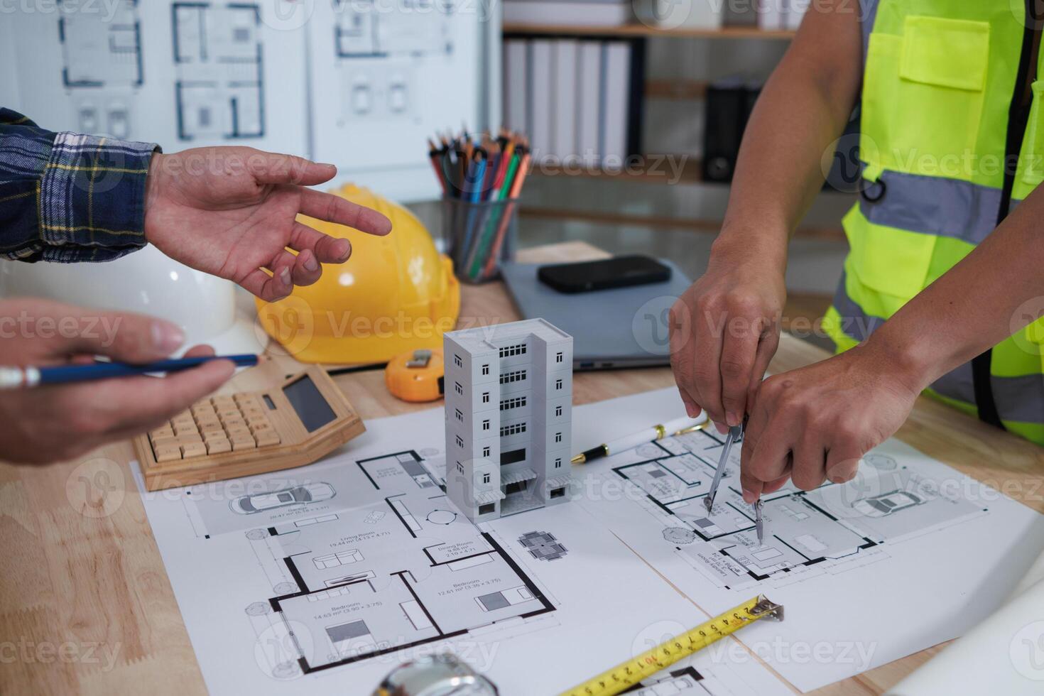 A team of engineers and architects discuss house plan design and estimate construction prices to suit the construction budget. Checking blueprints and documents with a team of engineers and architects Pro Photo