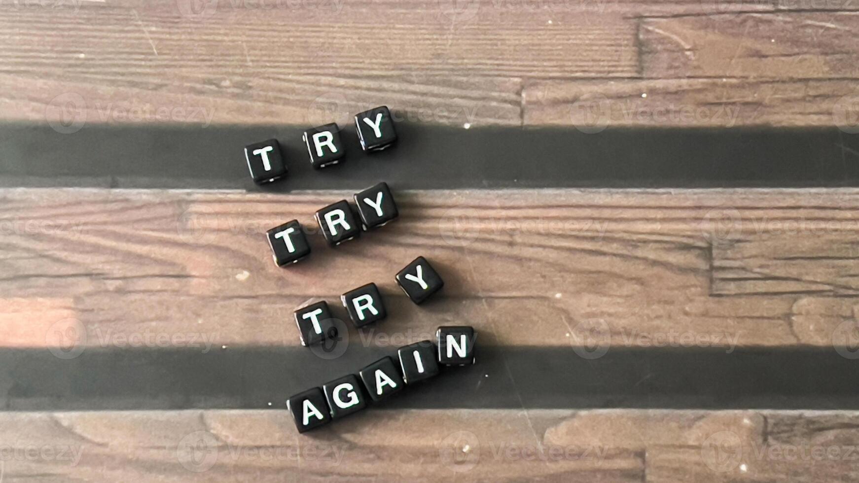 Concept of Try Try Try Again written on wooden blocks. Cross processed image on Wooden Background Pro Photo