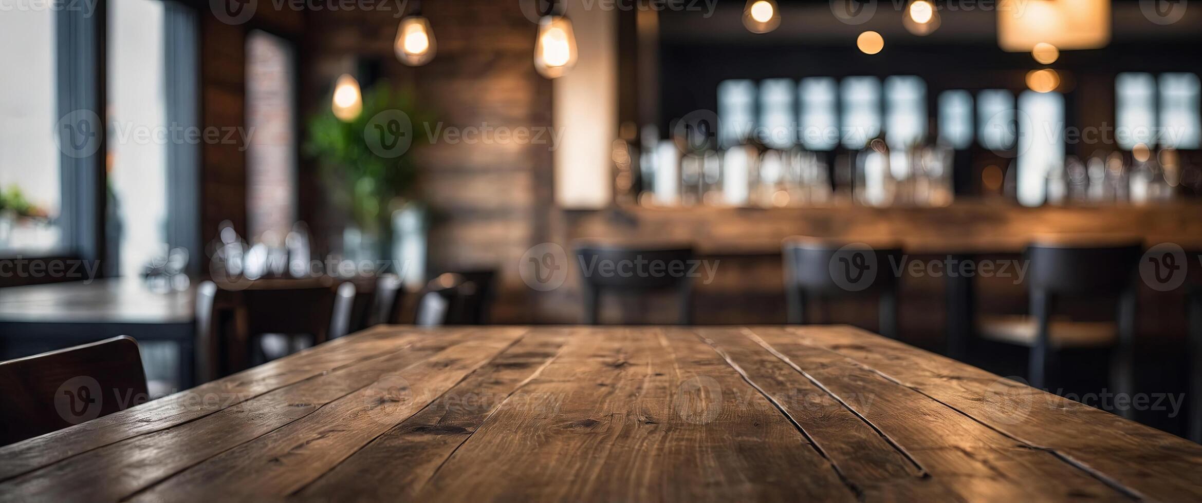 empty rustic wood table and blurred soft light table in restaurant with bokeh background product display template business presentation. Pro Photo