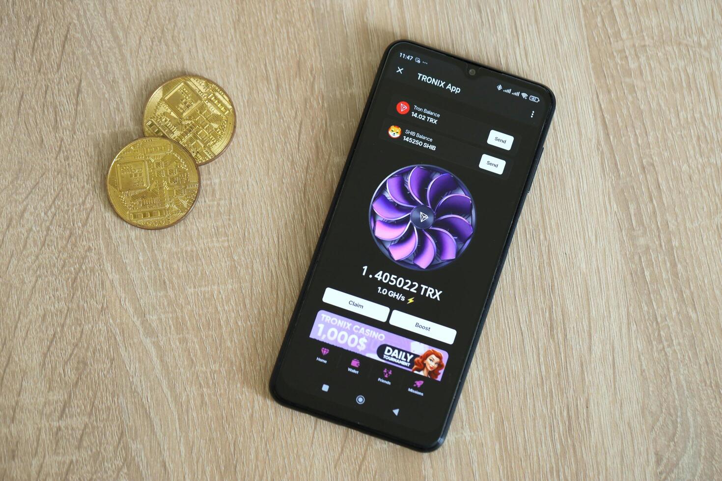 KYIV, UKRAINE - APRIL 20, 2024 Tronix App telegram bot on smartphone screen. Tronix App is a viral Telegram based crypto game for earn TRX tokens by managing virtual crypto exchange