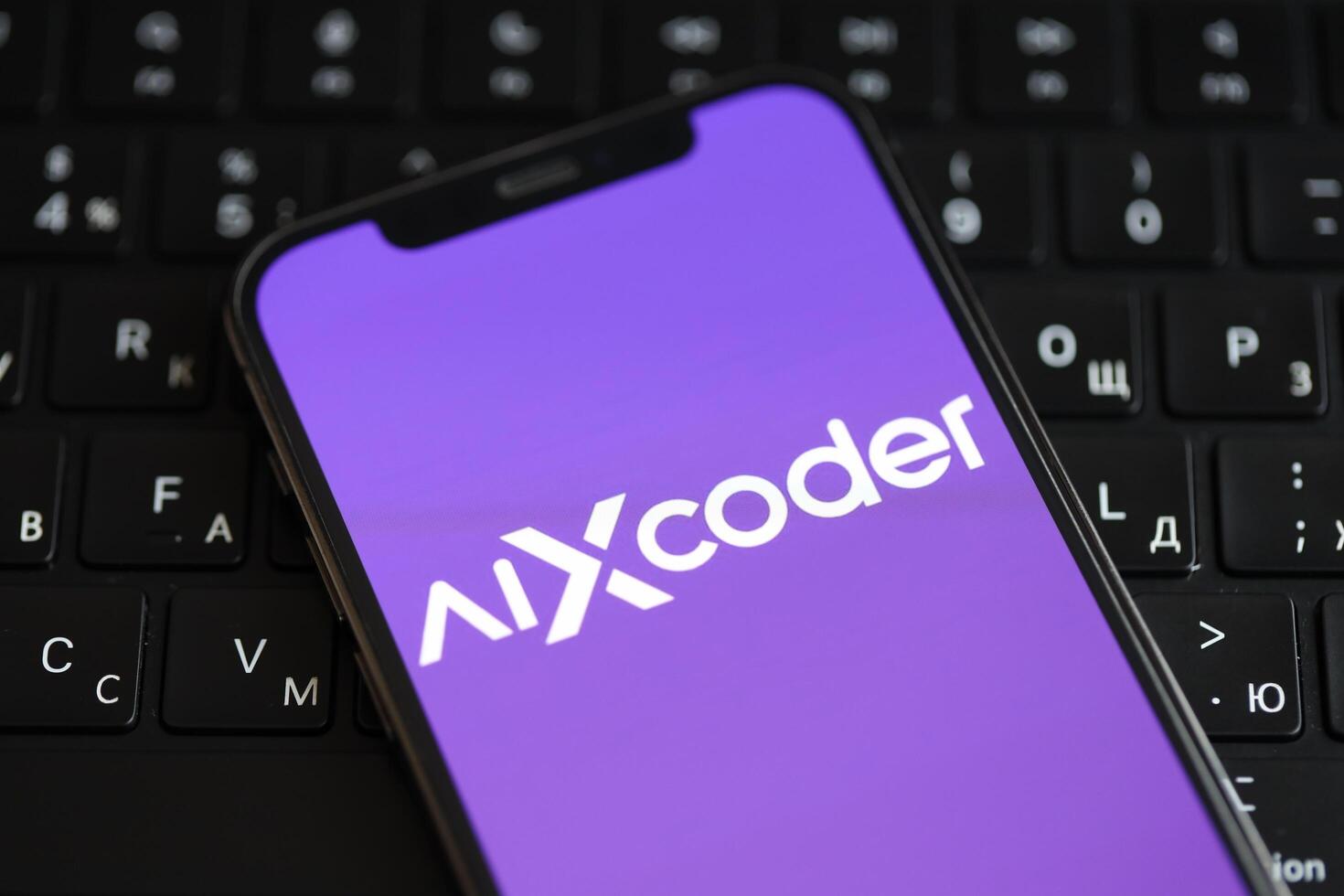 KYIV, UKRAINE - MARCH 17, 2024 AIXcoder logo on iPhone display screen and MacBook keyboard photo