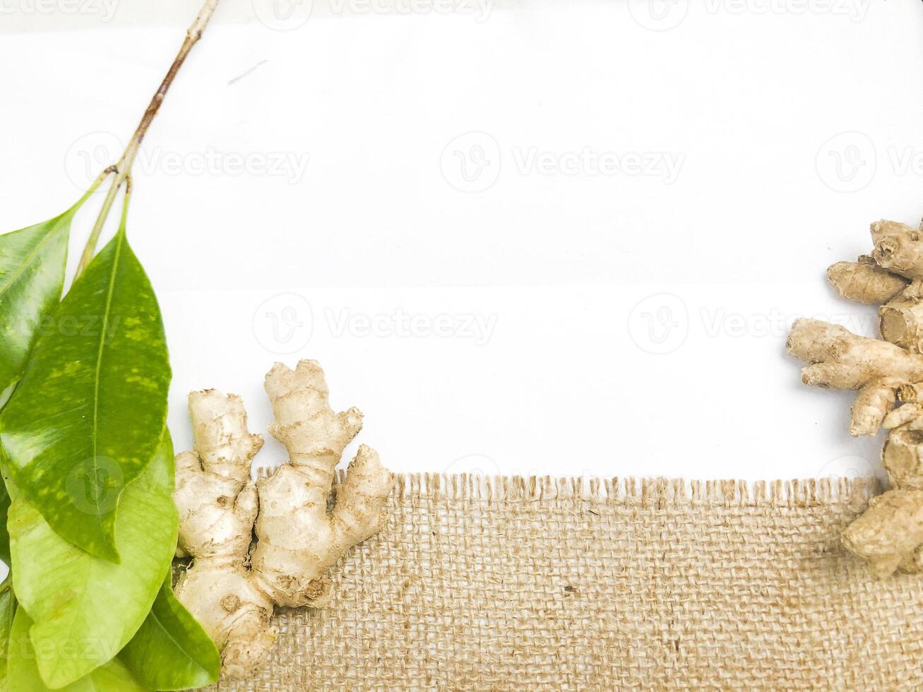Ginger root isolated on burlap fabric background.Ideal for use in health, culinary and content , Background template Pro Photo