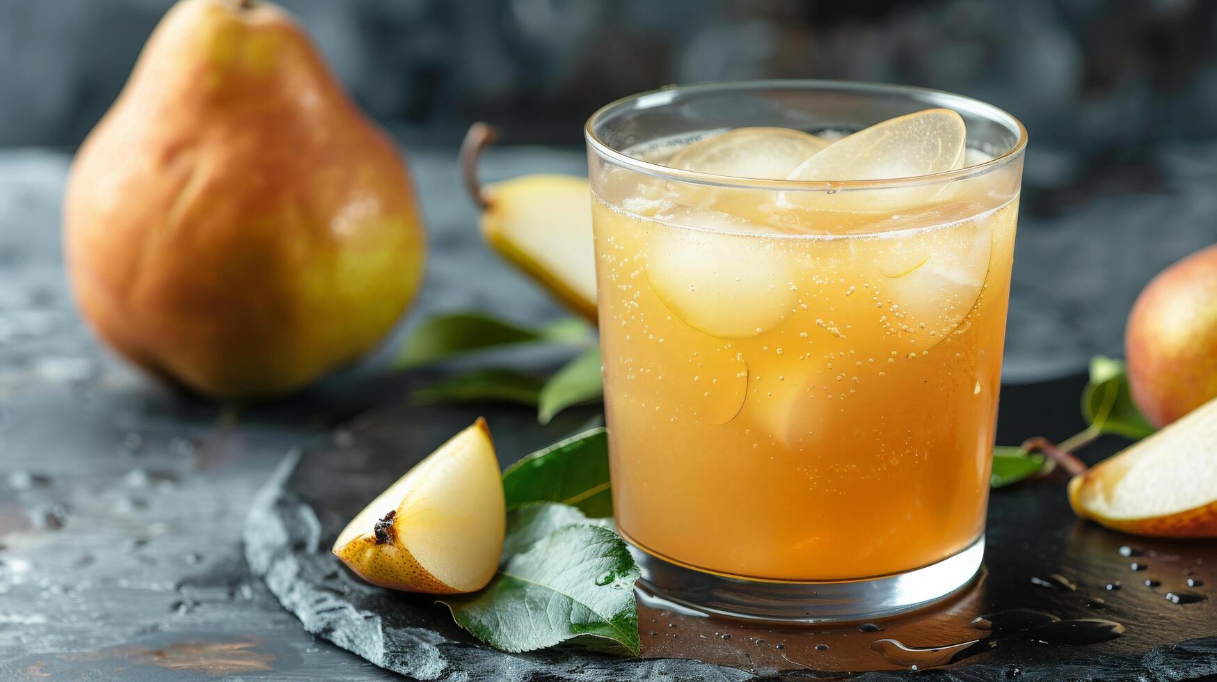 A glass of pear juice with ice cubes and pear slices, on a slate serving tray Free Photo