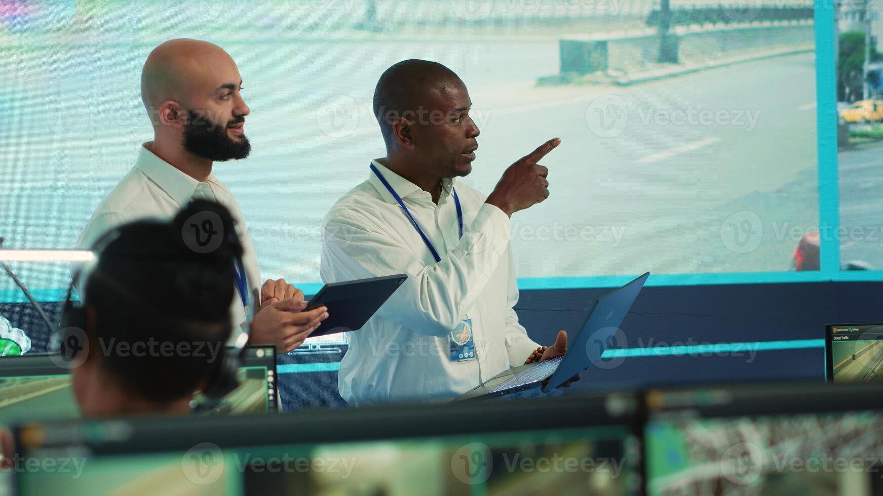 Diverse employees using CCTV surveillance system in monitoring traffic, tracking speed limits for public safety via satellite radar system. People operating on a big screen in control center. Camera A. Pro Photo