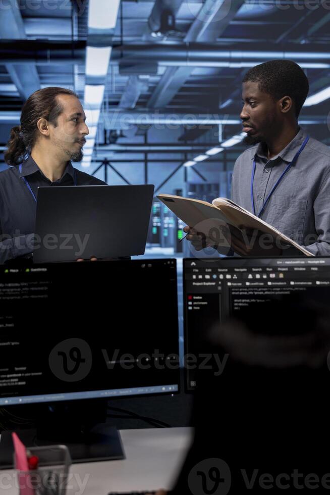 Manager getting feedback from engineer while overseeing data center, looking for firewall misconfigurations. Supervisor talking with workers in server room, asking about systems bottlenecks Pro Photo