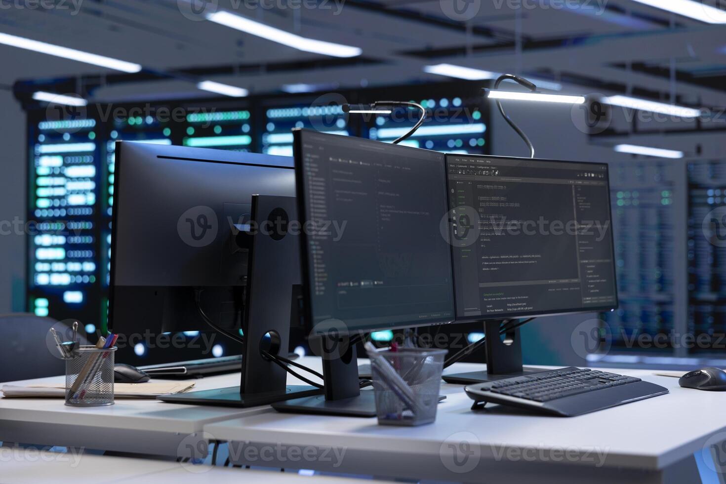Computers in data center facility used for managing supercomputers hardware energy consumption. Devices used for automation and monitoring processes in server farm, close up shot Pro Photo